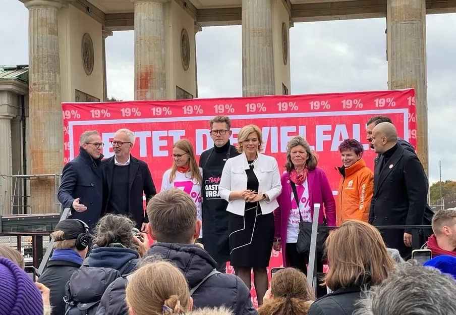 Unter dem Motto "Rettet die Vielfalt" haben Gastgeber am Montag am Brandenburger Tor ihrer Forderung nach dem Erhalt von 7 Prozent Nachdruck verliehen.