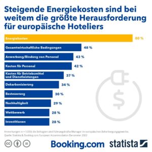Die europäischen Hoteliers sehen die Energiekrise derzeit als die größte Herausforderung. Eine überwältigende Mehrheit (80 %) nannte die Energiekosten als eine der größten Herausforderungen, denen sie gegenüberstehen. Weitere Sorgen bereiten den Hoteliers die allgemeine Wirtschaftslage (48 %) sowie die Kosten für Personal (42 %) und deren Rekrutierung und Bindung ans Unternehmen (43 %). In Deutschland werden die Energiekosten von 88 Prozent als Herausforderung bewertet, die wirtschaftlichen Rahmenbedingungen dagegen von 59 Prozent und 55 Prozent der Befragten in Deutschland sehen den Personalmangel als herausfordernd an.