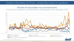 Vor allem in den beiden Lockdown-Phasen erfuhren die verschiedenen Tagesreise-Aktivitäten eine gegensätzliche Entwicklung im Hinblick auf ihre Anteilswerte am Gesamtvolumen. Das heißt, Outdoor-Aktivitäten wie Wandern und Radfahren, der Besuch von Naturattraktionen sowie Erholungs- und Spazierfahrten boten speziell in den Lockdown-Zeiten häufig die einzige Möglichkeit für Ausflüge und konnten Anteilszugewinne am Gesamtvolumen verzeichnen. Auch in der ersten Re-Start-Phase zeigten sich diese Aktivitäten noch überdurchschnittlich stark, bevor sie sich im Sommer teilweise wieder Richtung Normalniveau entwickelten.