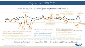 2020 haben die Deutschen rund 19 Prozent weniger Tagesreisen unternommen als in einem Normaljahr. Der Tagestourismus weist damit deutlich geringere Verluste auf als der Übernachtungstourismus, der 2020 laut Destatis um 39 Prozent zurückging. Das DWIF-Tagesreisen-EKG zeigt einen deutlichen Rückgang der privaten Tagesreiseaktivitäten während der ersten Lockdown-Phase zwischen Kalenderwoche 12/2020 und 19/2020 im Vergleich zu den Vorjahren – zu Beginn der Einschränkungen sogar um bis zu 67 Prozent.