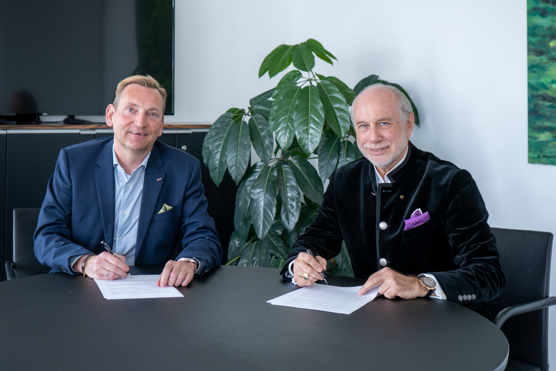 Christian Ehrmann, Vorstandsvorsitzender der Ehrmann AG, und Klaus Graf von Moltke bei der Vertragsunterzeichnung. © Foto: Ehrmann AG