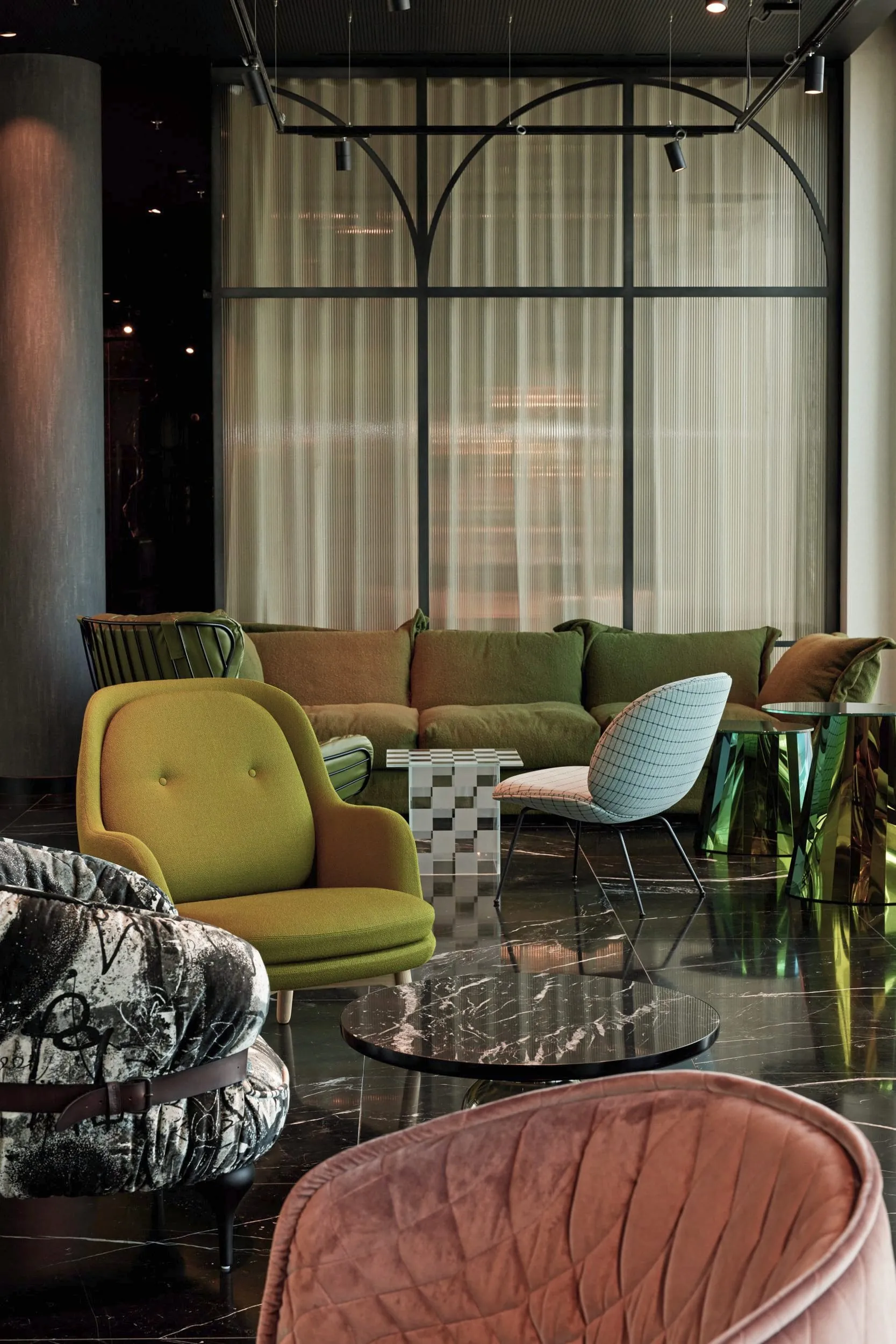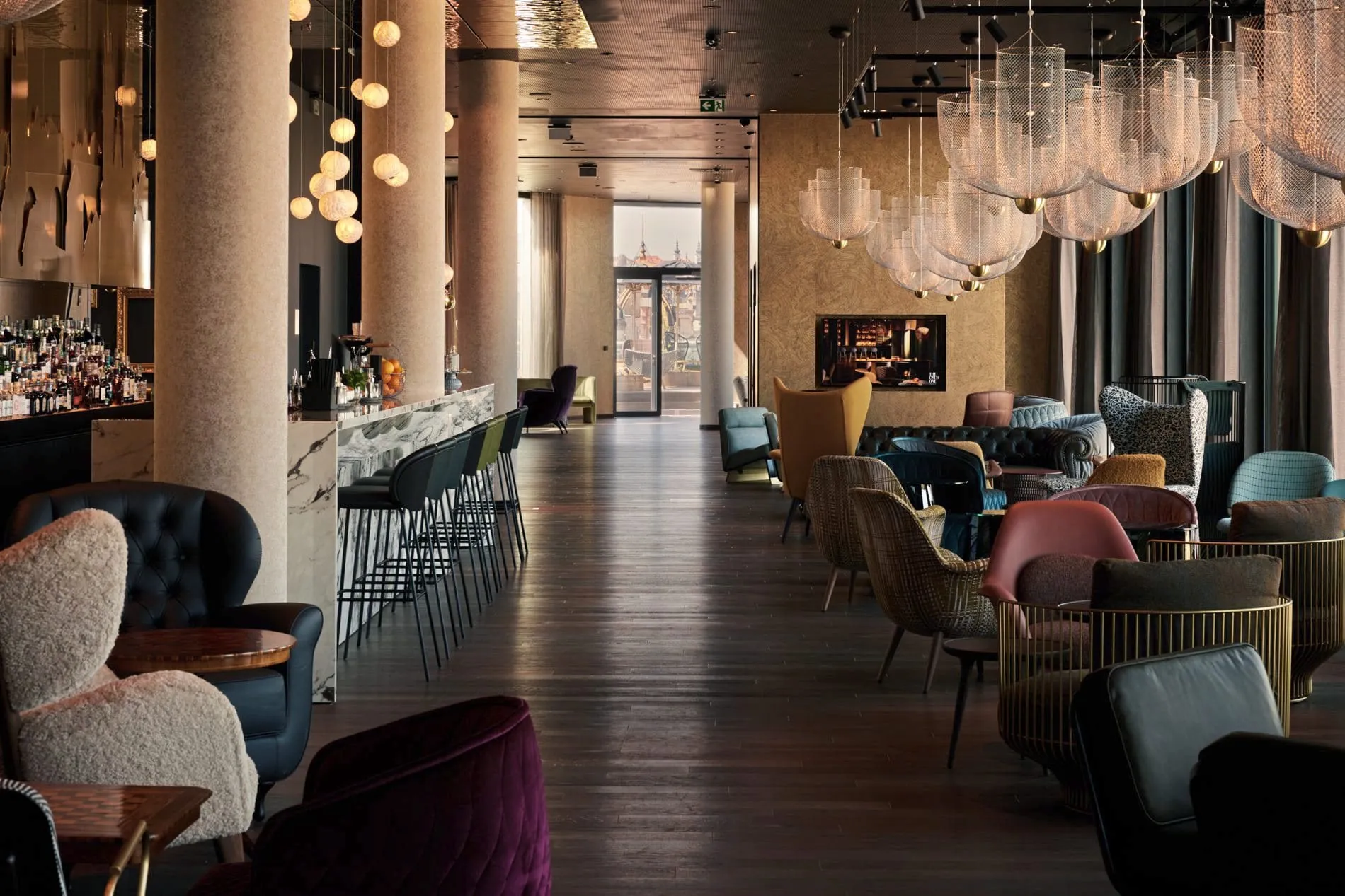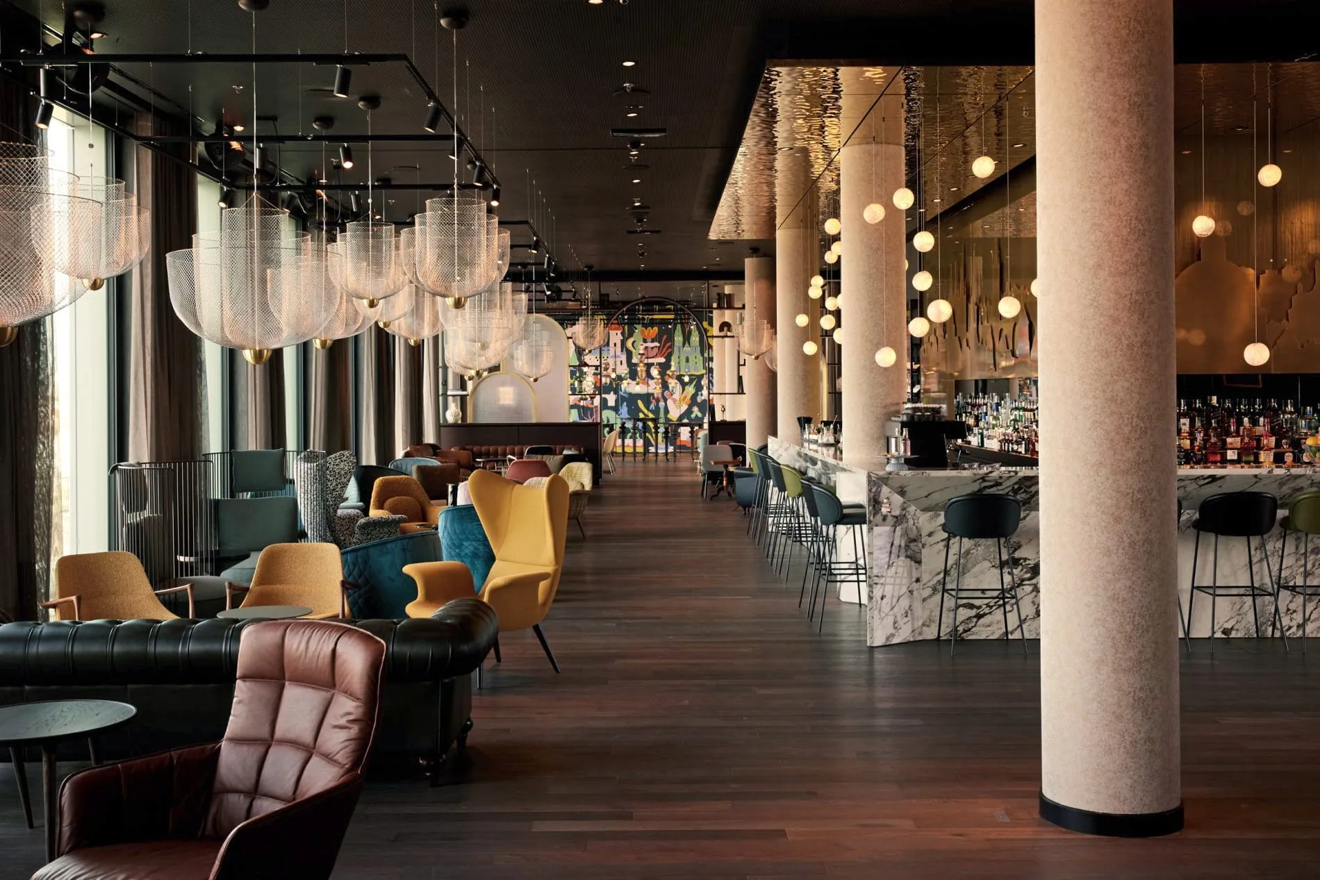 Seit April heißt das The Cloud One Prag seine Gäste in 382 Zimmern und mit einer Panoramabar in der neu entwickelten Hybernska Straße willkommen. Im Erdgeschoss des Hotels wird die Prager Geschichte durch den Charme alter Gebäude und trendiger Cafés modern interpretiert. Der farbenfrohe Eingangsbereich ist in warmen Tönen gestaltet, während dunkle Natursteinböden einen Kontrast schaffen.