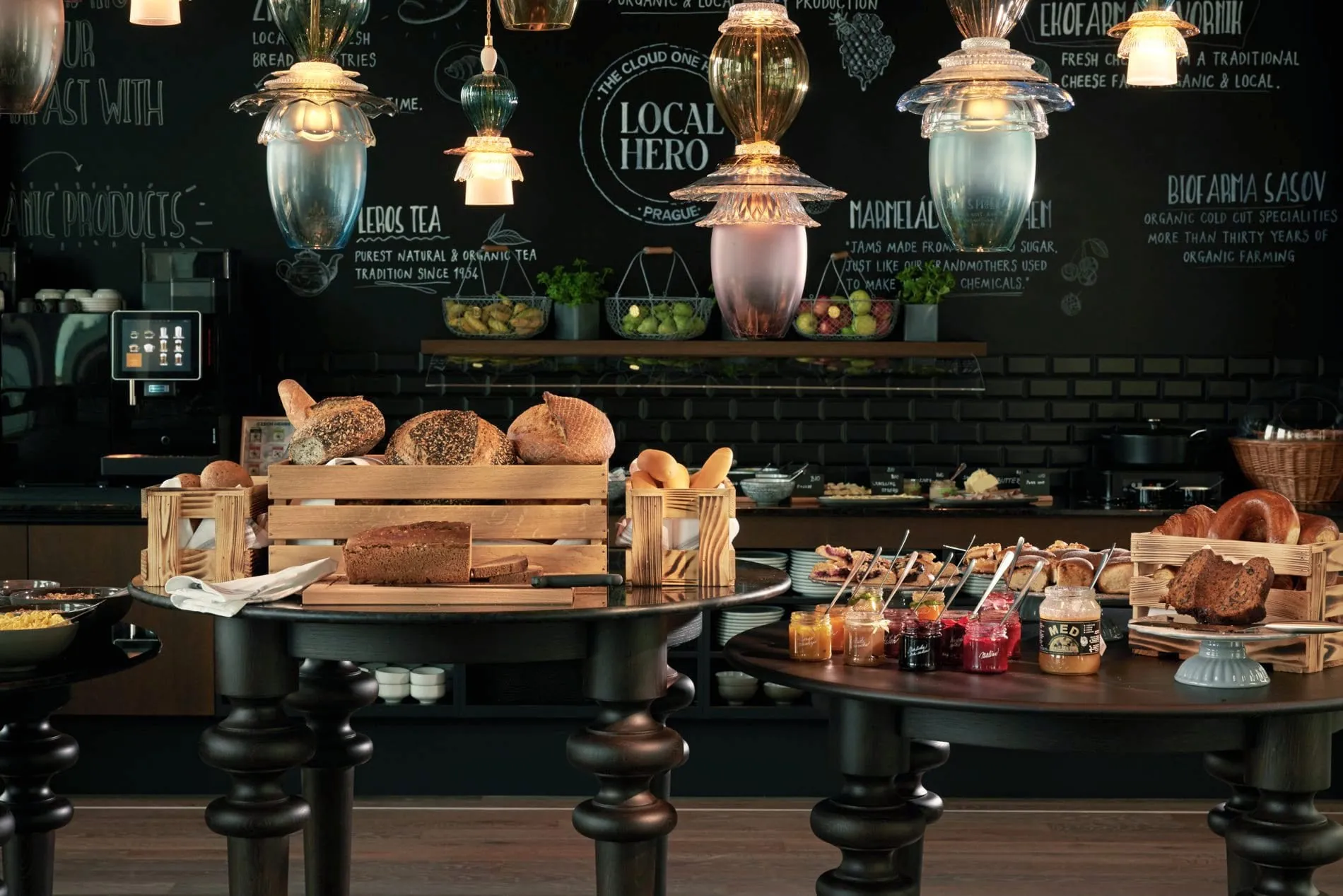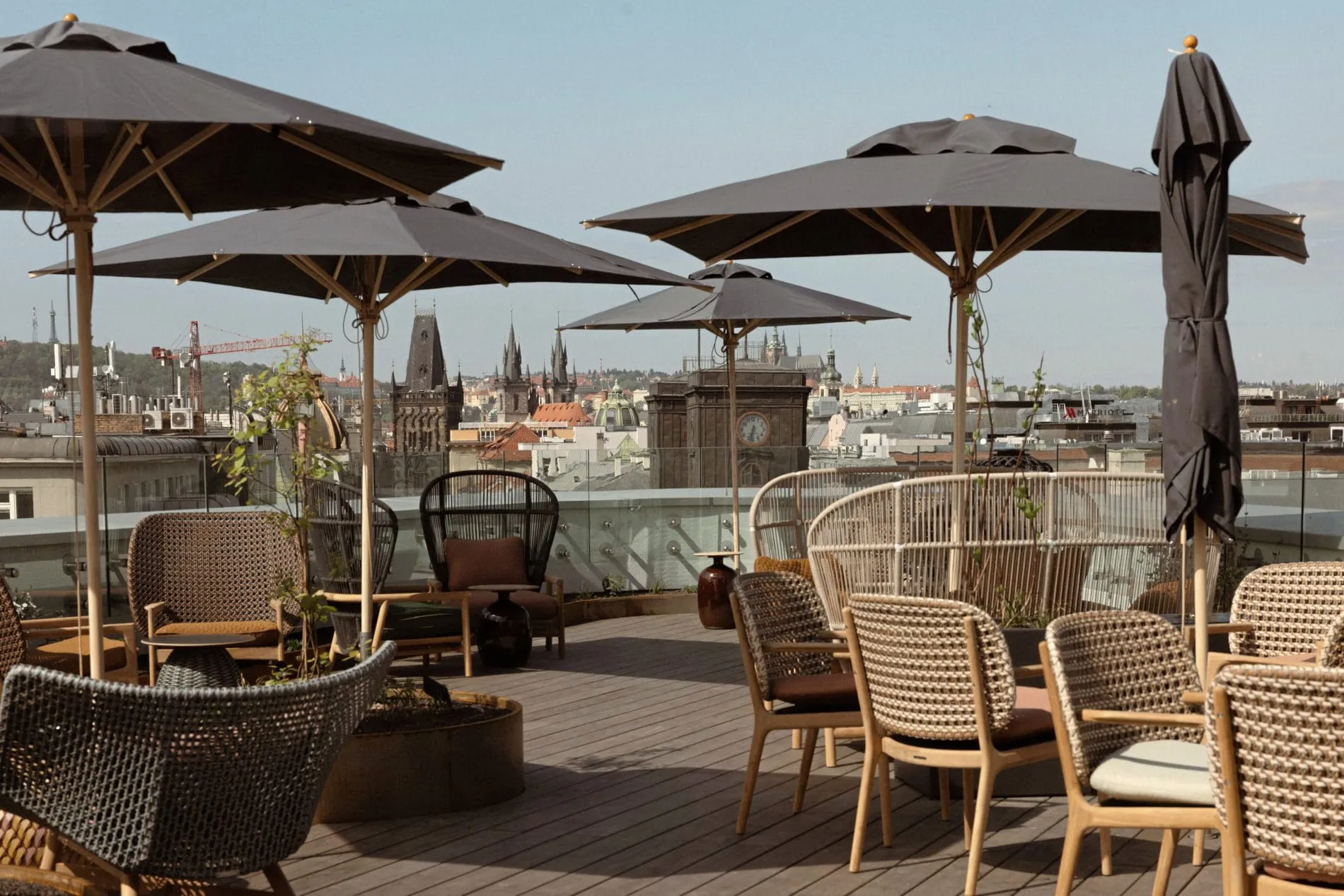 In der Cloud One Wine Bar & Lounge in der sechsten Etage tauchen gedämpfte Töne den Raum in eine stylische Atmosphäre. Das Design der Kaffeestation soll an das markante Eingangstor des Geburtshauses von Franz Kafka erinnern. Abends verwandelt sich die Lounge in eine Bar mit einem goldenen Segel, das eine Referenz an die Silhouette von Prag und den Fluss Moldau ist. Ein weiterer Eyecatcher ist die Illustration der Barbara Idesova. Sie hat die Wahrzeichen der Stadt in ihrem eigenen, dekorativen Stil erstellt und sich dabei von Natur, Sonne, Musik, Mythen und Abenteuern inspirieren lassen. Hinzu kommt ein begrünter Außenbereich, der über 100 Sitzplätze umfasst und einen Blick auf Prag bietet. Jeden Donnerstag legt ein DJ zu den „Sounds in the Cloud“ auf.