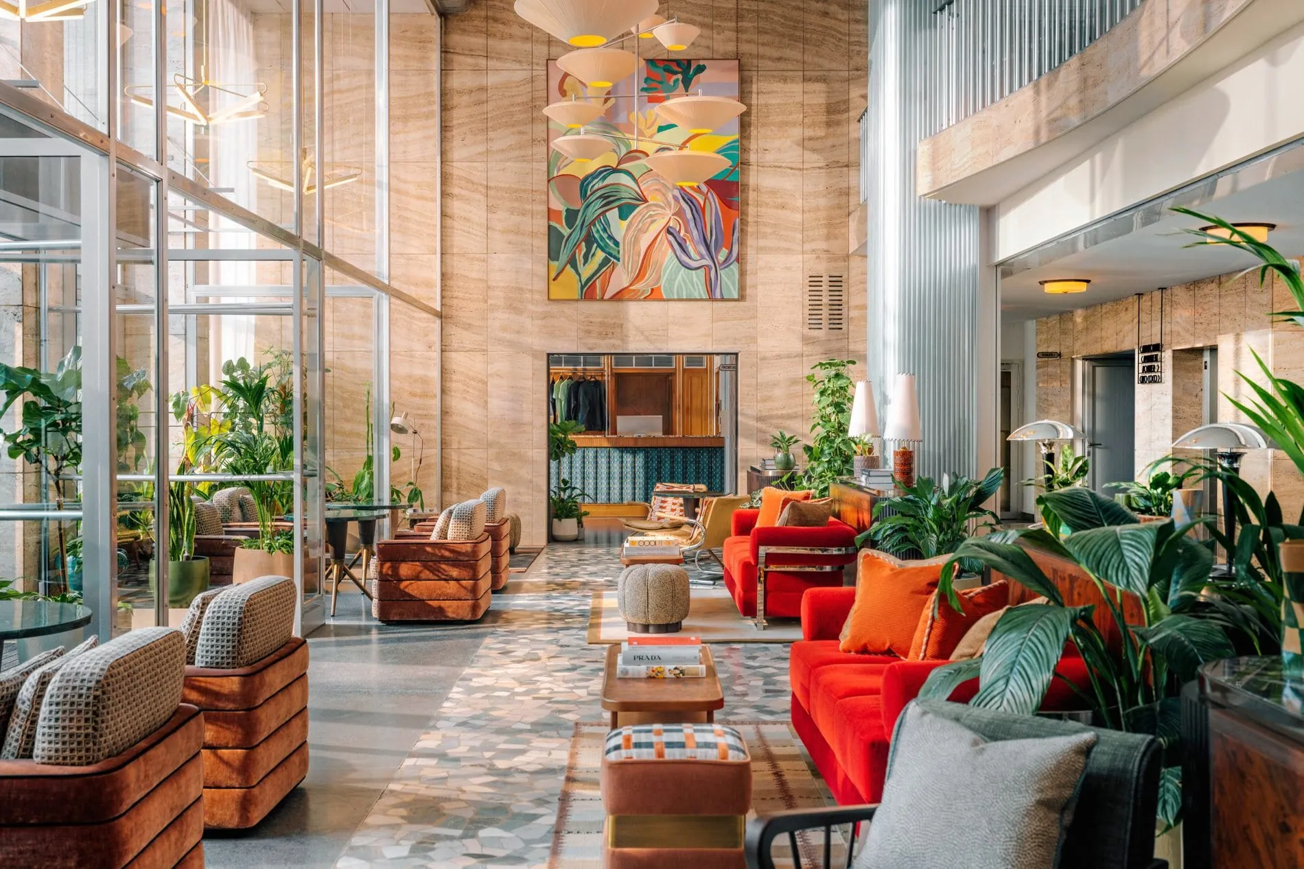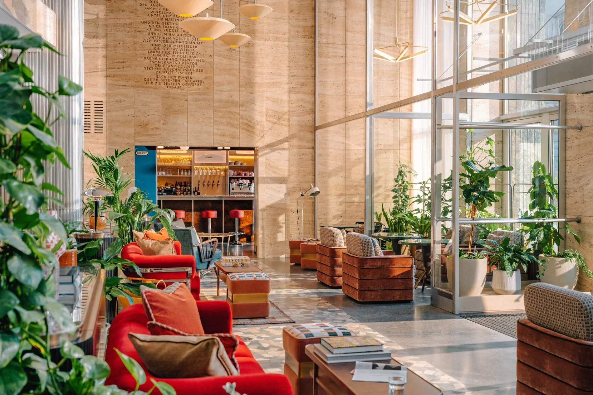 AIME Studios zeichnet für das Interior Design verantwortlich, das sowohl von Carl Appels Ästhetik der Jahrhundertmitte als auch der ikonischen Bewegung der Wiener Werkstätte inspiriert ist. Das architektonische Erbe des marmorverkleideten Gebäudes aus den 1950er Jahren diente als wichtiger Ausgangspunkt für die Inneneinrichtung des Hotels und wurde sorgfältig bewahrt. Die weitläufige Lobby wird von den originalen Travertin-verkleideten Wänden und Terrazzoböden eingerahmt und ist mit rubinroten Sofas, Sesseln im Stil der 1950er Jahre, üppigem Grün und Mid Century-Leuchtobjekten ausgestattet. Das Treppenhaus im hinteren Teil der Lobby verleiht dem Raum, der früher das österreichische Gewerbehaus beherbergte, einen Hauch von Dramatik.
