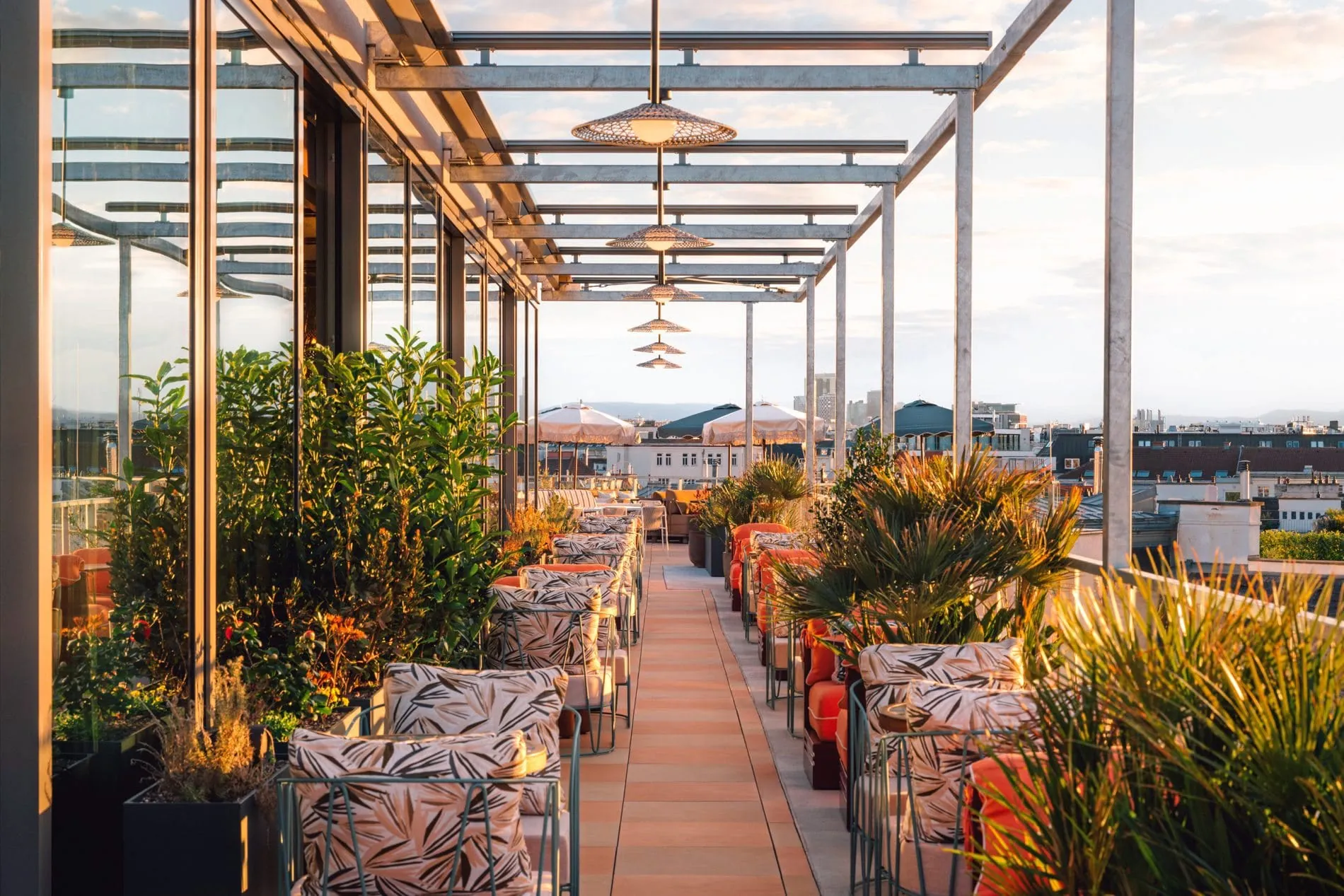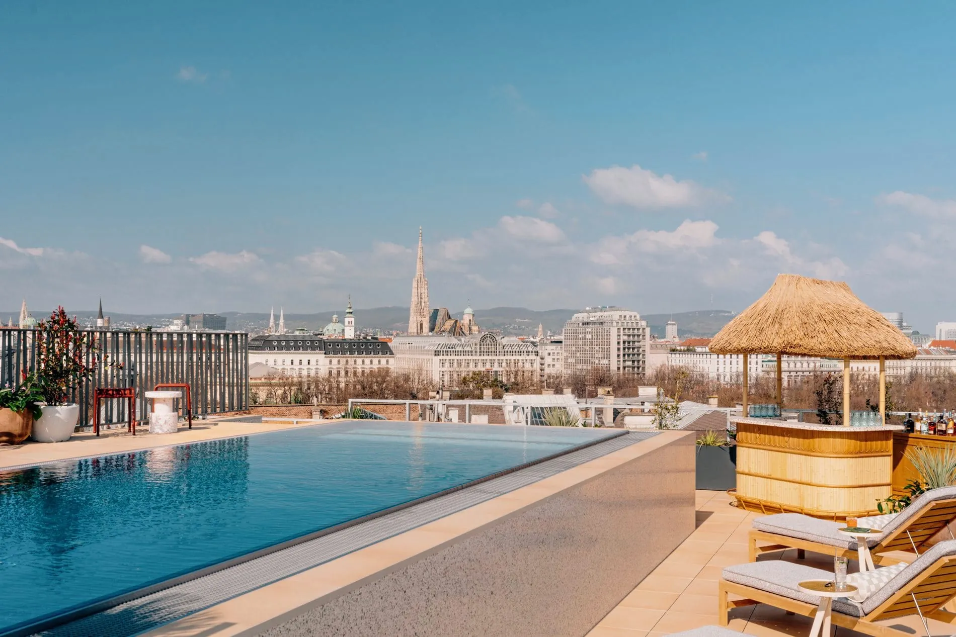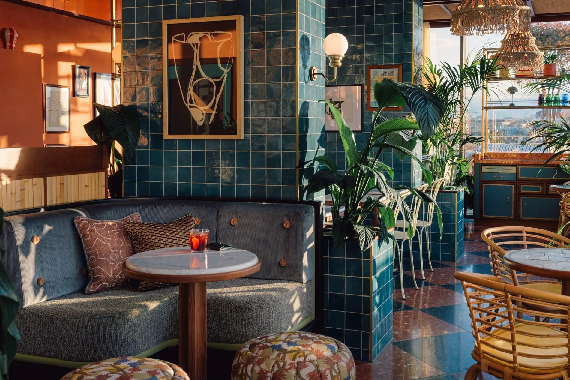 Auf dem Dach des Hotels thront die neue Rooftop-Bar "Cayo Coco", die das Havanna der 1950er-Jahre in die österreichische Hauptstadt bringt. Gäste können dort Getränke an einem Pool mit 360-Grad-Blick genießen. Rot-schwarzer Terrazzo geleitet in den Hauptraum von Cayo Coco, wo Bambus und Rattan maßgefertigte Möbel zieren und geflochtene Pendelleuchten von der mit Seegras verkleideten Decke baumeln. Kunstwerke fangen den Geist Havannas ein, während leuchtend blaue Keramikfliesen auch im Innenbereich maritimes Flair vermitteln.