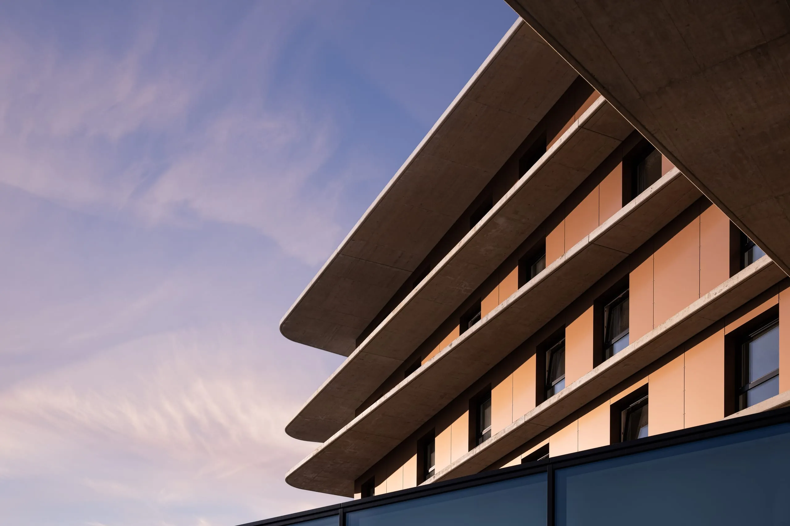 Die auskragenden Geschossdecken beschatten auch die angrenzenden Hotelzimmer.