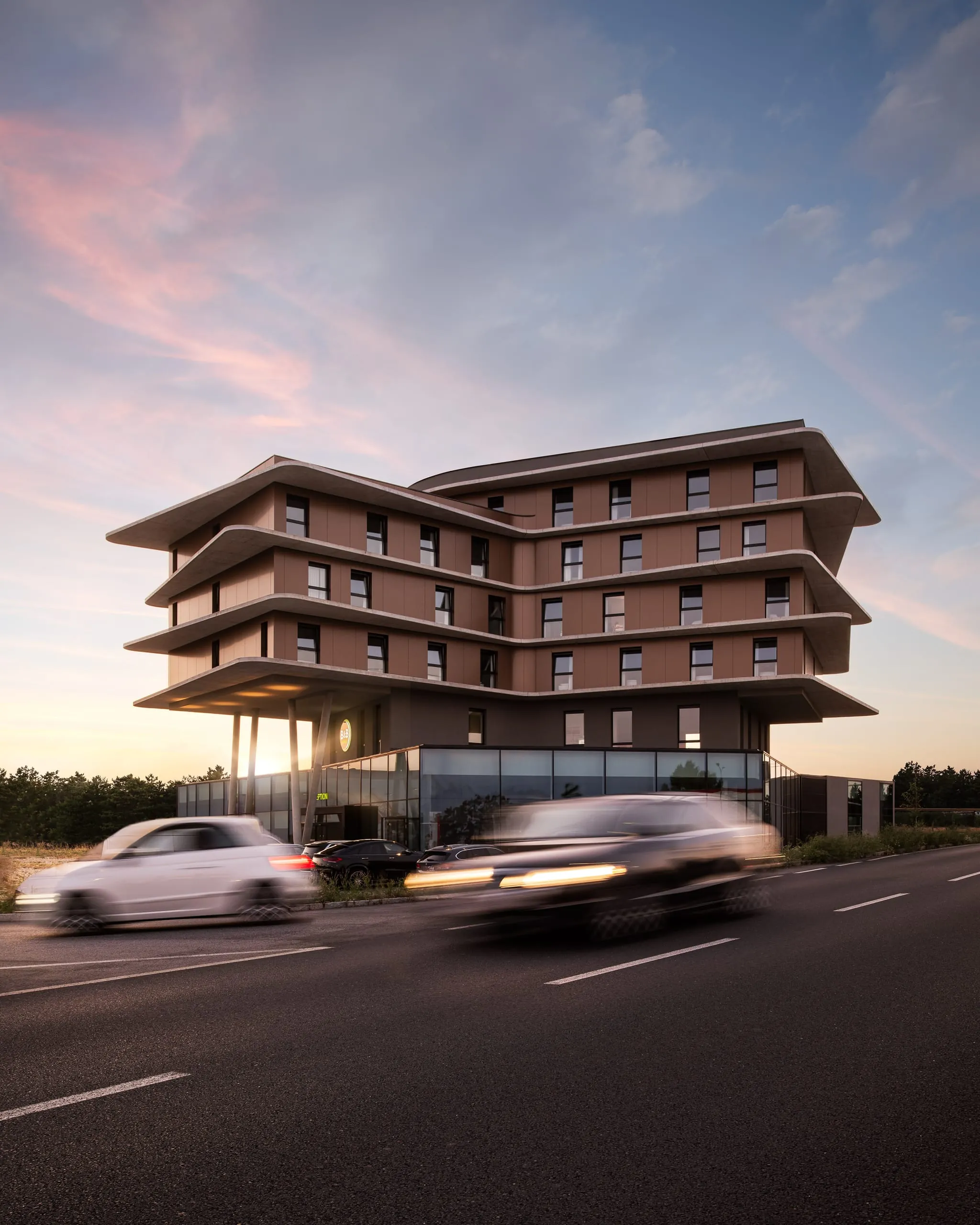 Das Hotel liegt direkt an der Einfahrt zum Industriezentrum und ist bereits von der Autobahn aus gut zu sehen. Die Architekten von Zechner & Zechner setzen das neue Gebäude in einen Kontrast zu den angrenzenden Hallen- und Gewerbebauten, die sich vorwiegend in die Breite ausdehnen. „Wir stapeln die Funktionen übereinander und gestalten so einen für die Region wichtigen 'Merkpunkt‘", erläutert Architekt Martin Zechner die Entwurfsidee. „In die Höhe statt in die Breite war hier die gewählte Strategie“.