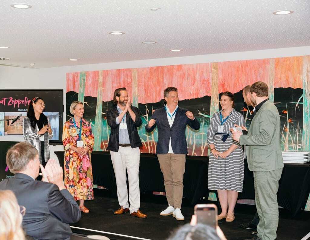 Preisverleihung des Tophotel Newcomer Awards 2025: (von links) Jurymitglied Carolin Brauer, Mario Sallinger und Victoria Klinkhammer (beide Hotel Zur Wiener Staatsoper), Jan Eigelshoven(Tin Inn Hotels), Babette Kierchoff und Janek Burgdorff (beide John & Will Silo-Hotel by Guldsmeden) und Jurymitglied Fabian Wiesler. - © Faye Schicht