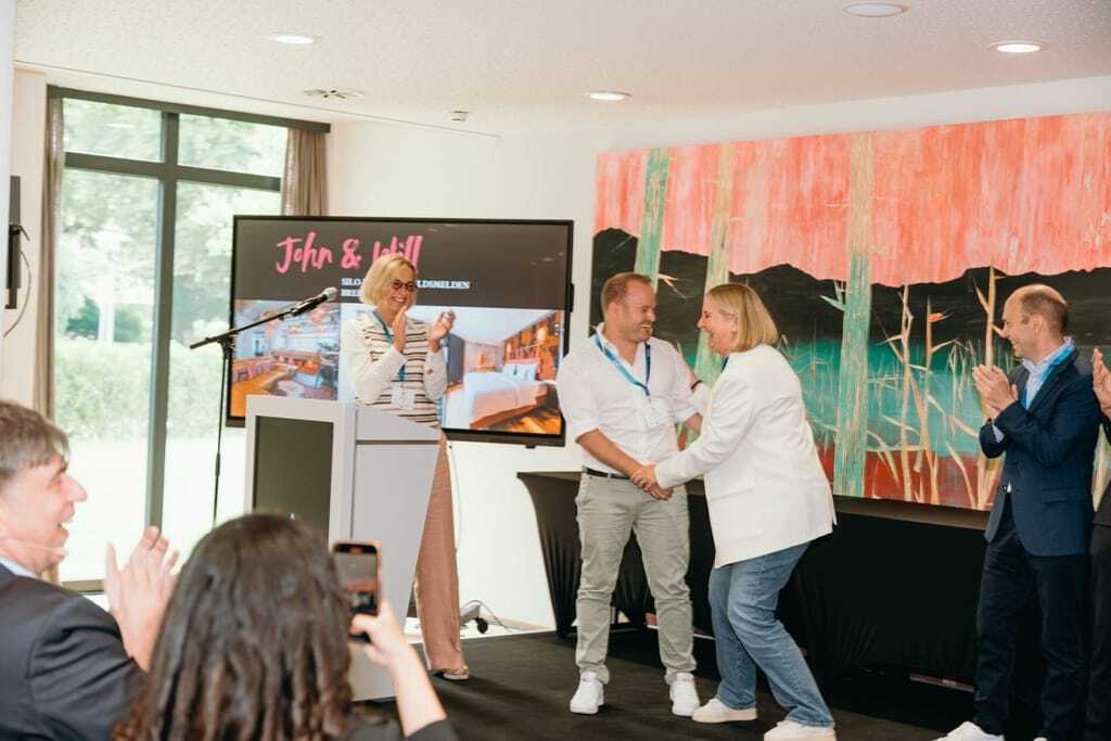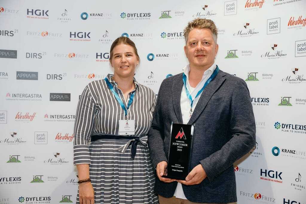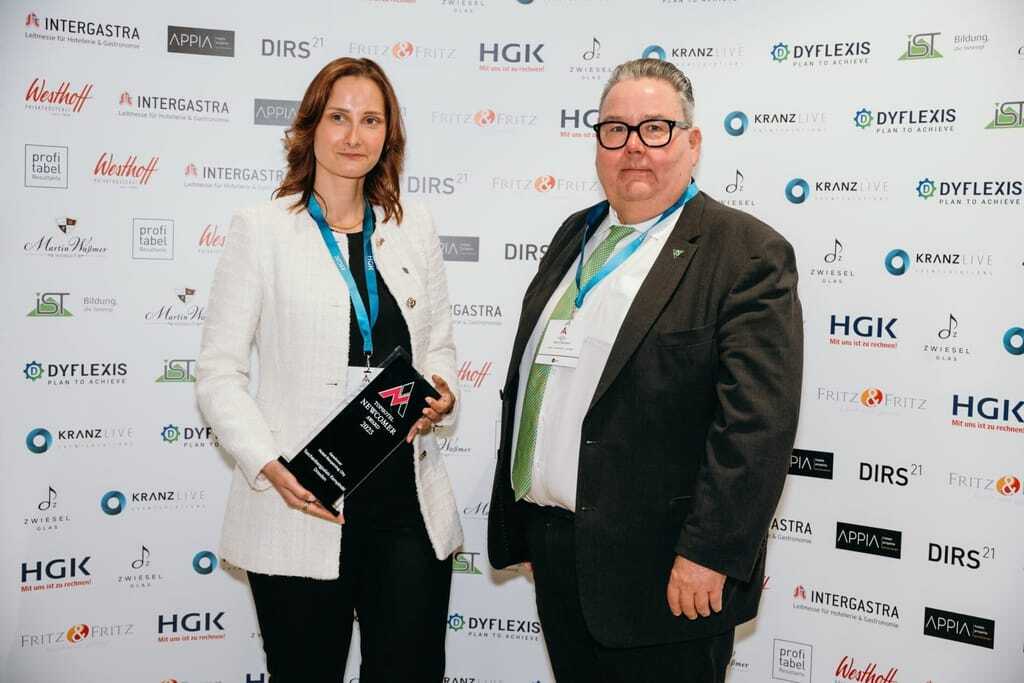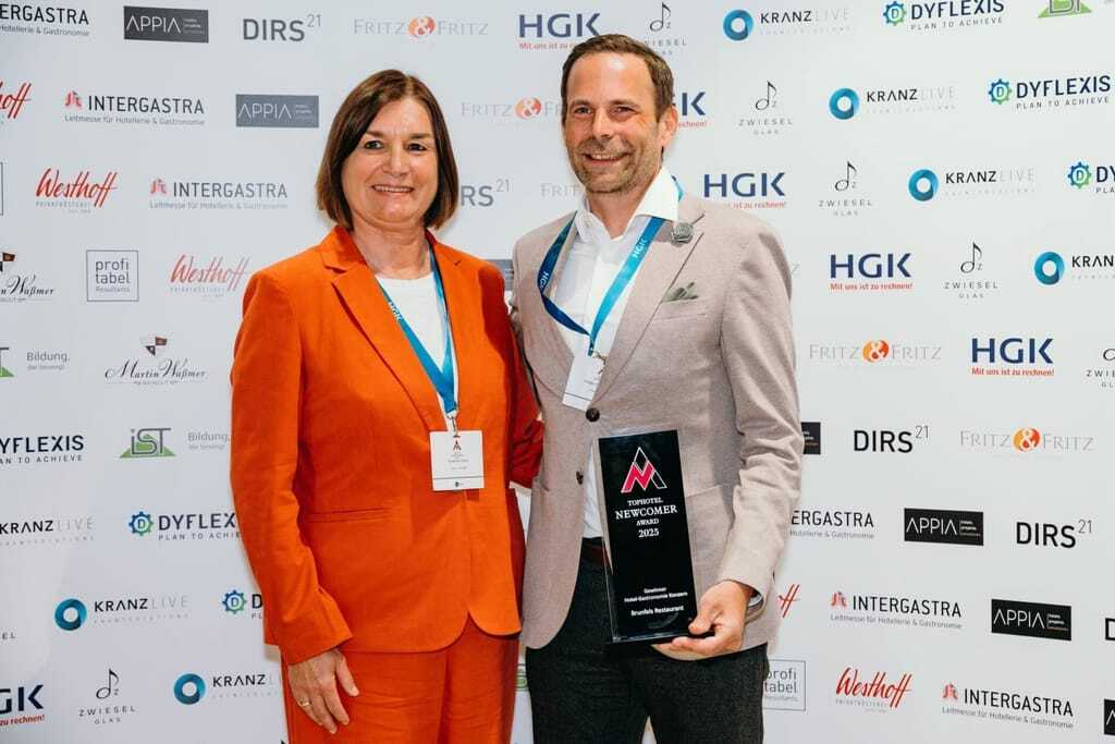 Preisverleihung des Tophotel Newcomer Awards 2025: Jurymitglied Susanne Stauß mit Holger Hanselmann vom Brunfels Hotel. - © Faye Schicht