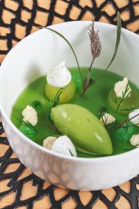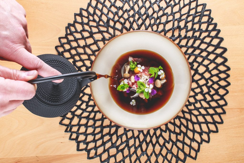 Ohnehin arbeitet Tienelt gern mit Suden, Vinaigrettes oder leichten Soßen, was seine Kreationen nie zu schwer werden lässt. Kohlenhydrate kommen bestenfalls als gepuffter Reis zum Einsatz – Leichtigkeit ist in der Feinschmeckerszene aktuell sehr gefragt. Auch fleischlose Gerichte sind auf der Karte zu finden – ein Trend, der sich sogar in der Zwei- und Drei-Sterne-Gastronomie durchsetzen konnte. Welcher Aufwand in diesen Speisen steckt, beweist der Sellerie, der im Salzteig ausgebacken wurde und als Tranche auf den Teller kommt. Dazu gibt es buttriges Selleriepüree, Schnittlauch- und Haselnussöl, geröstete Haselnüsse, Bergamotte-Gel, Selleriesamen, Staudenselleriesaft als Schaum und gehobelten, getrockneten Sellerie als Würze.