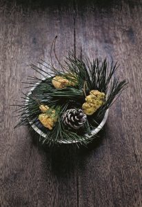 Frittierte Fischblasen und Sauerrahm aus Fichtennadeln