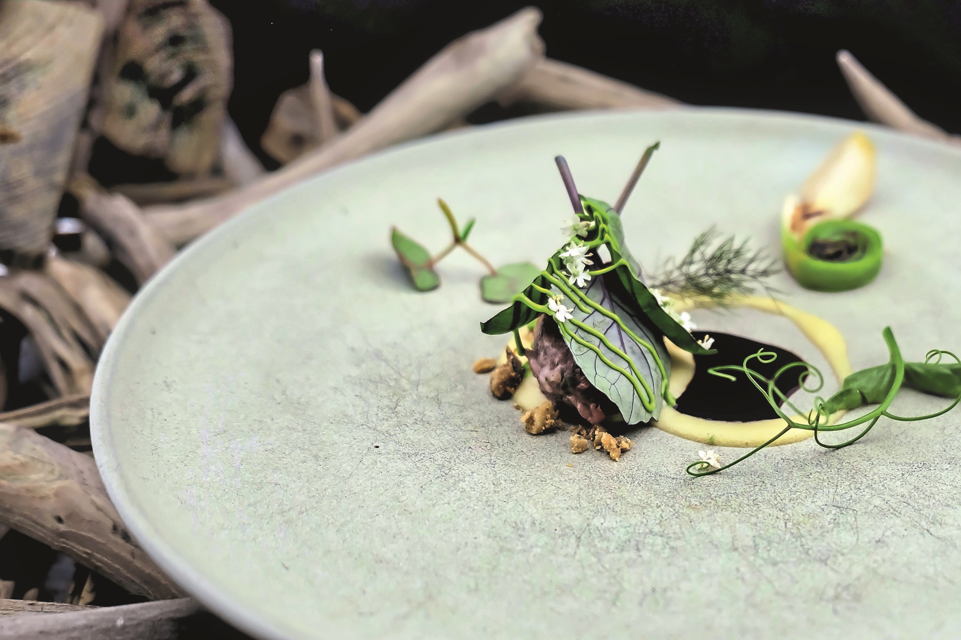 Auf den Teller bringt er dann eine Scheibe von in Heu ausgebackener Roter Bete, die in einem tief aromatischen, fermentierten Sud von Ackerbohnen serviert wird. Hinzu kommen hauchdünne marinierte Scheibchen Kohlrabi und würzige Noten von getrocknetem Liebstöckel. Ein Kaisergranat wird auf Schwarzkohl gebettet, mit münzgroßen Apfelscheiben belegt und mit etwas Rauchöl und getrocknetem Kohlpulver beträufelt und bestreut. Interessant: Ein süßes Element wird nicht hinzugefügt, wodurch die Eigensüße des Krustentiers voll zur Geltung kommt.