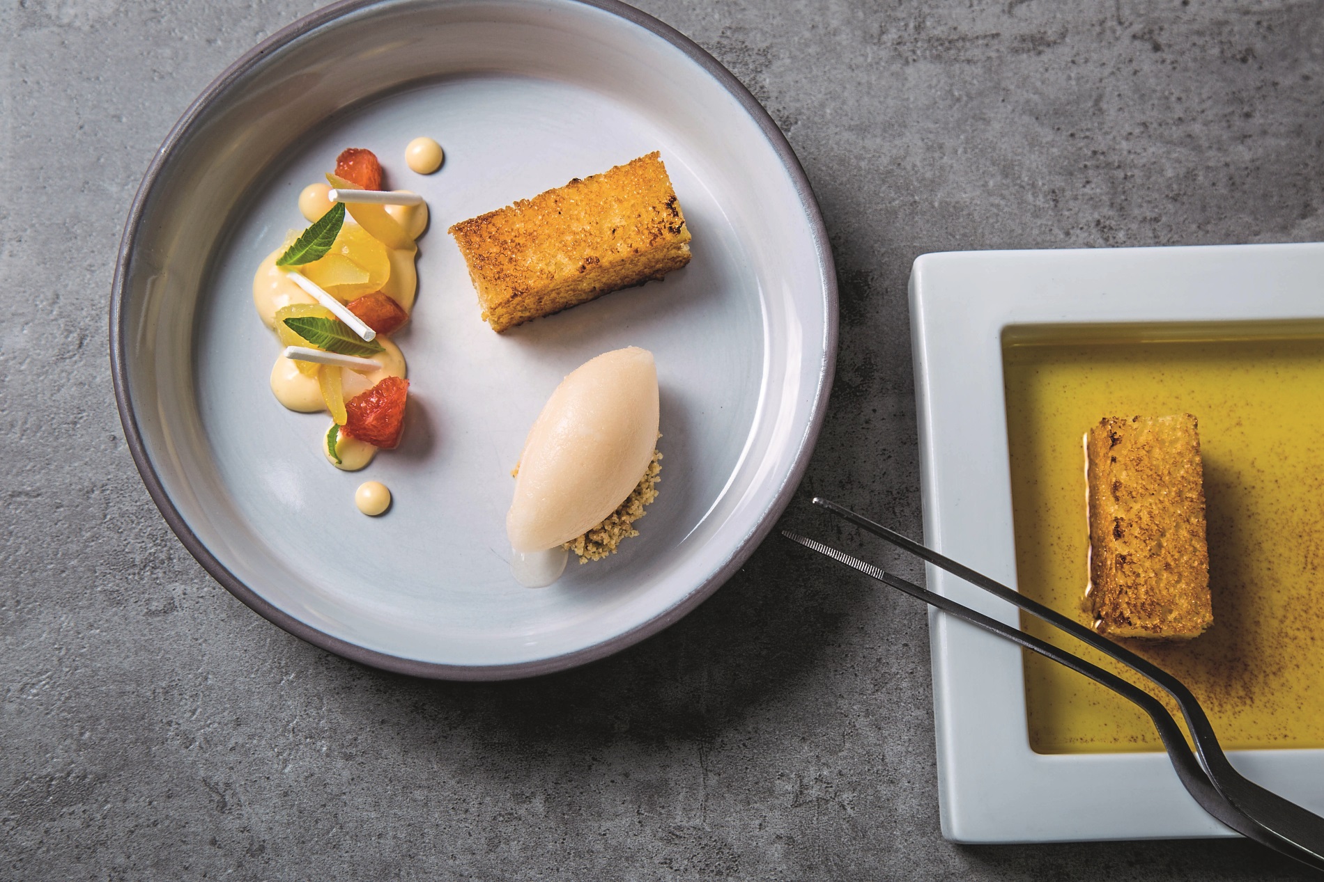 Galgantknospen und -wurzeln, ausgebackenes Chililaub, Maracuja-Eigelb-Creme und Ingwerchips – nachhaltige Waren, die fast alle aus dem Tropenhaus stammen; genau wie die Zitrusfrüchte, die im Dessert zusammen mit dem fränkischen Nuss-Butter-Kuchen serviert werden.