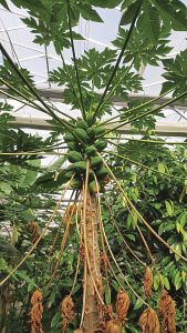 Integriert ist in das Tropenhaus außerdem eine Fischzucht mit Nilbuntbarschen und Pacus, was das Polykulturprinzip des Projekts komplettiert: Das Wasser der Zuchtbecken wird durch die Exkremente der Fische zu einem natürlichen Düngestoff und als Gießwasser weiterverwertet. In dem tropischen Klima gedeihen auf diese Weise Früchte bis zur vollständigen Genussreife, darunter Papaya, von denen im Jahr 2017/18 rund 1.350 Kilogramm geerntet wurden. Aber auch Sternfrucht (210 kg), Guave (230 kg) oder Passionsfrüchte (195 kg) lassen sich hervorragend im einheitlichen Klima des Gewächshauses kultivieren. Vielversprechend in Ertrag und Qualität zeigen sich auch Versuche mit Zitrusfrüchten wie Calamondin oder Kaffir-Limetten. Außerdem werden Ingwer, Galgant oder Kurkuma angebaut. Alle Waren sind biozertifiziert.