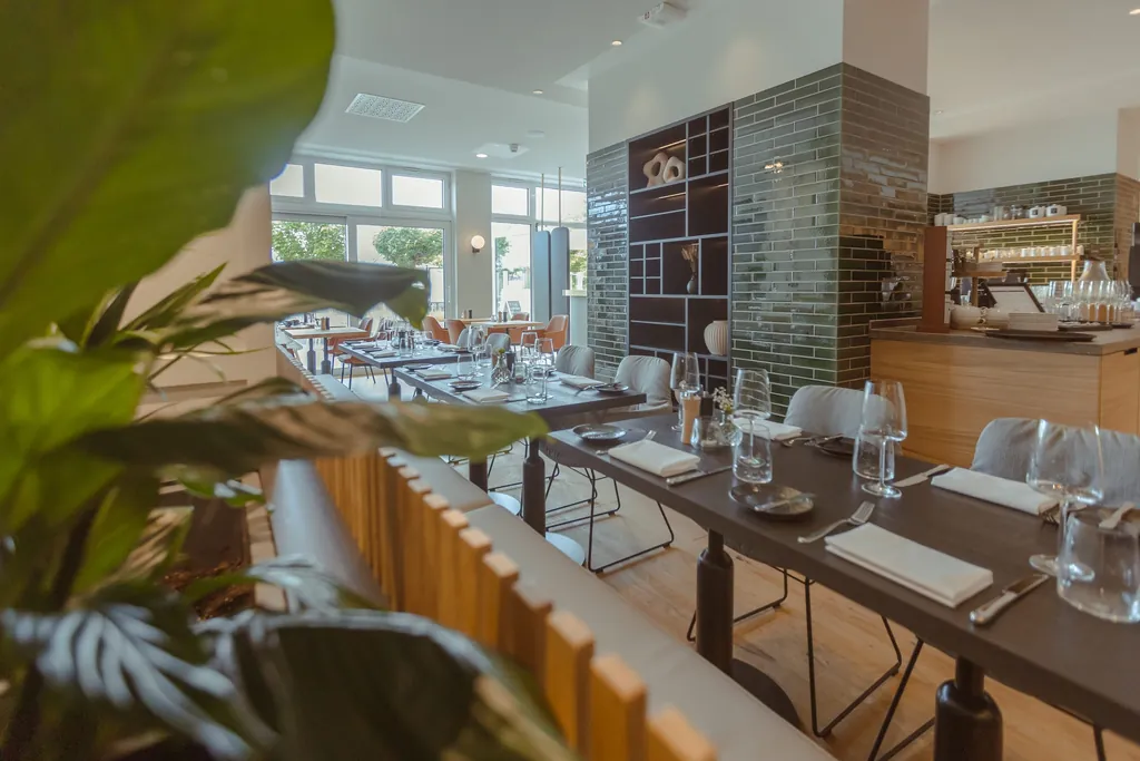 Im Mai wurde das Designhotel auf Usedom nach einer Komplettmodernisierung wiedereröffnet. Hoteldirektorin Veronika Glöckner, die selbst früher an anderer Stelle Restaurantleiterin war, hat sich intensiv mit der Tableware auseinandergesetzt und sich entgegen ihrem ersten Impuls, auf Ostseeblau zu setzen, dann doch für klassisches Weiß beim Geschirr entschieden. „Das Küchenteam sollte nicht gegen eine Farbe antreten müssen.“ Farbtupfer gibt es dennoch, und zwar in Form schwarzer und dunkelblauer Begleitschälchen und -teller, zum Beispiel für Brot, Butter oder Chutney. Zudem setzt das angedeutete Hotellogo am Rand der Hauptgangsteller Akzente. Auch die Gläser sind teils mit Logo graviert. Ohnehin hat Veronika Glöckner stets das ganze Haus im Blick: Die strukturierten Stoffservietten beispielsweise sind auf die Bettwäsche abgestimmt.