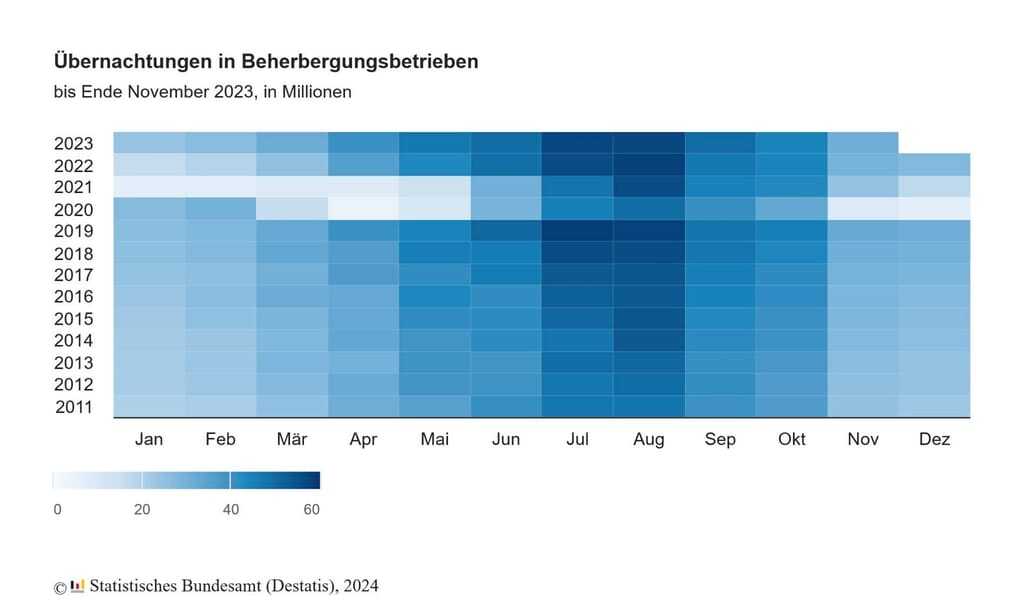 Die Zahl der Übernachtungen von Reisenden aus dem Inland war mit 25,4 Millionen um 3,4 Prozent höher als ein Jahr zuvor. Sie lag damit um 3,6 Prozent unter dem Vorkrisenniveau. Bei ausländischen Gästen wurde binnen Jahresfrist ein Anstieg um 7,8 Prozent auf 5,5 Millionen Übernachtungen verzeichnet. Das waren 10,5 Prozent weniger als im November 2019.