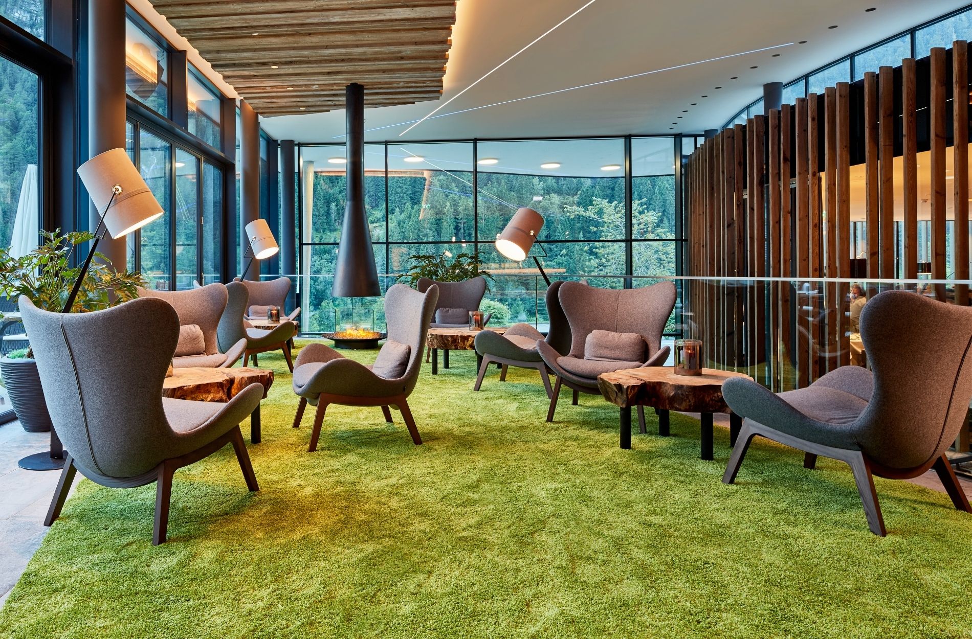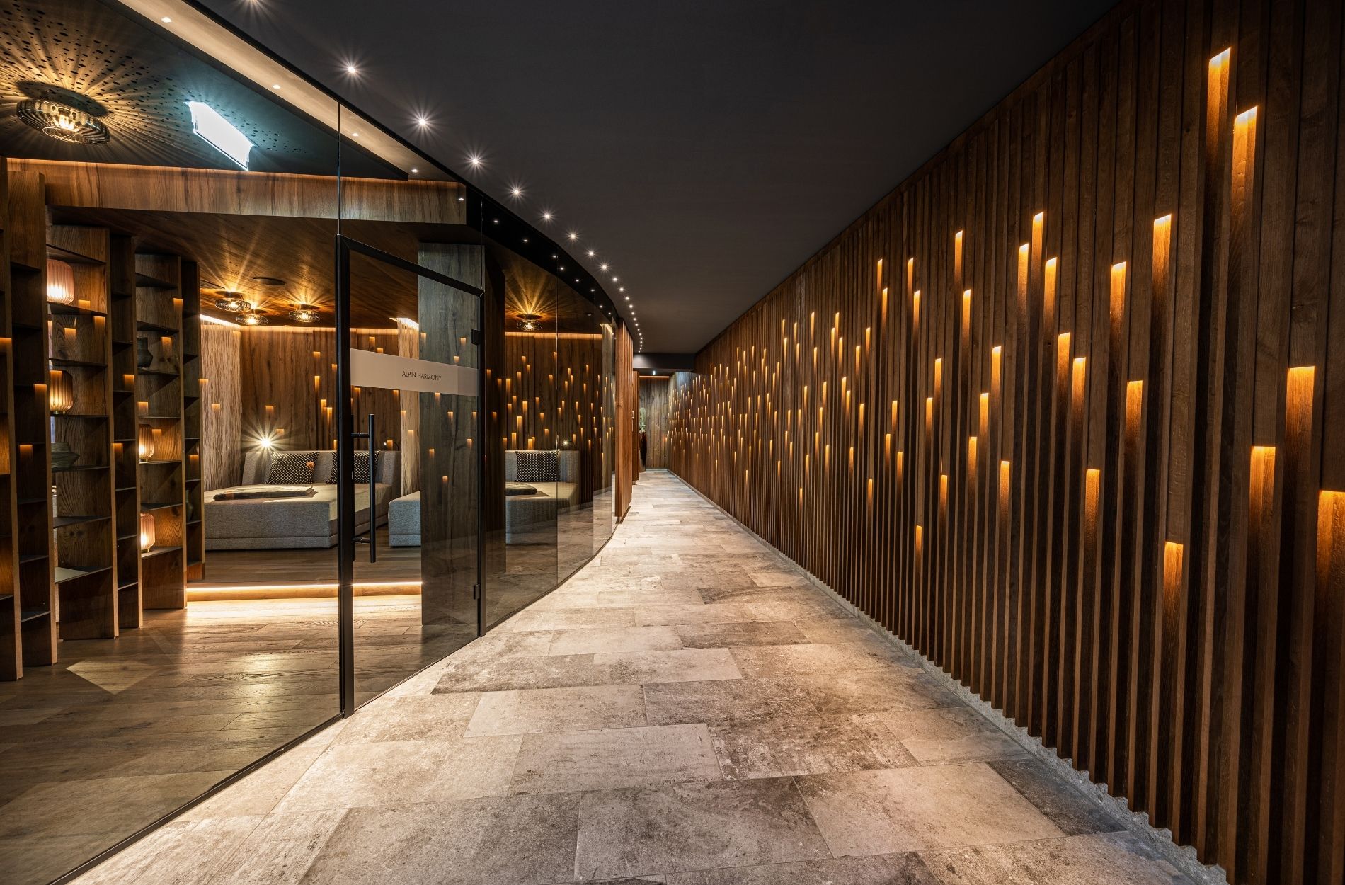 Die Beleuchtung ist fast immer indirekt, an einigen Stellen setzen Designer-Lampen ein Highlight. Zudem kommt im gesamten Haus viel Glas zum Einsatz, das Ein- und Ausblicke schafft. Auf diese Weise sind Sichtachsen entstanden, die die Natur direkt ins Hotel holen. Im „Private Spa“ wird es dank samtig anmutender Decken und Sofadesigns noch weicher und kuscheliger. Die Lichtspots sind zurückhaltend eingesetzt und illuminieren doch großzügig, sodass das Auge Raum und Größe auf Anhieb erfassen kann und keine verborgenen Nischen entstehen.
