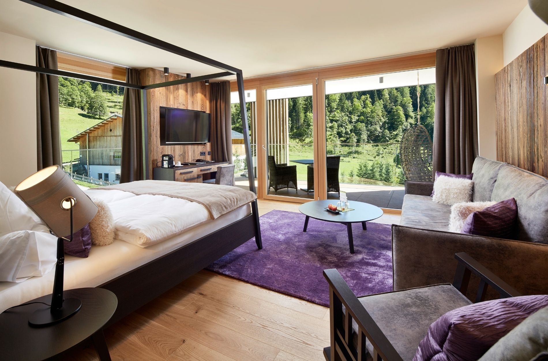 Die übrigen 20 Zimmer und Suiten hat Harald Habersatter 2016 neu bauen lassen. „Eigentlich haben wir seit 2002 immer irgendwo eine Baustelle“, sagt der 41-Jährige, der in jenem Jahr mehr oder weniger den Staffelstab von seinen Eltern übernommen hat. Heute führt er das Haus mit seiner Frau Christina, seine Eltern arbeiten im Hintergrund weiter tatkräftig mit. In Sachen Ökologie und Nachhaltigkeit verfolgt der Hotelier einen langfristigen Plan: 2007 hat er ein Biomasse-Heizkraftwerk bauen lassen, das mit Hackschnitzel „gefüttert“ wird. Die Bäume dafür wachsen im hoteleigenen Wald.