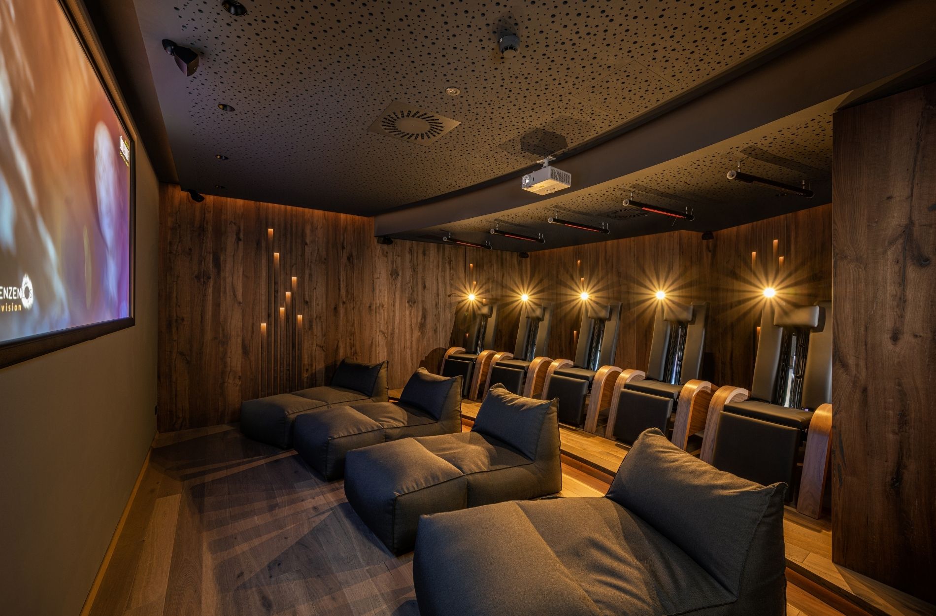 Neben der Event-Sauna haben die Gäste nun die Wahl zwischen einer Bio-Almhüttensauna, einer Steinsauna, einem Aroma-Dampfbad, einem Sole-Dampfbad und einer Familiensauna. Ein Highlight ist das Wellness-Kino mit den fünf Infrarot-Sesseln, die Wärme auf den Rücken abstrahlen. „Infrarot ist eigentlich eine langweilige Sache, weil es eine gewisse Zeit zum Aufheizen braucht. Deswegen wollten wir Unterhaltung bieten“, meint Habersatter. Auf einem großen Bildschirm laufen daher zu festen Zeiten regionale und Naturfilme.