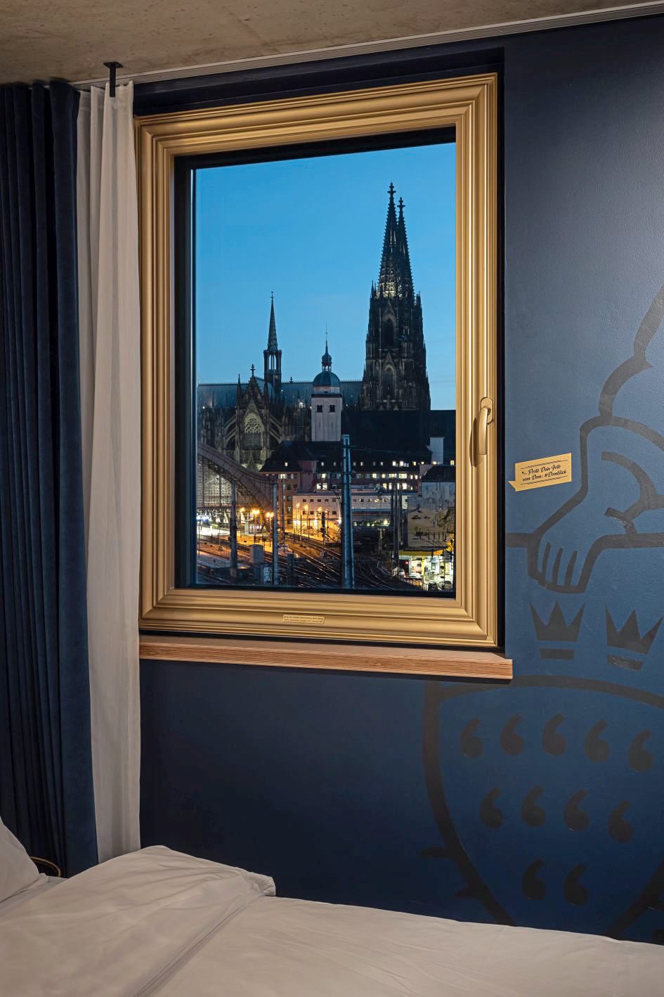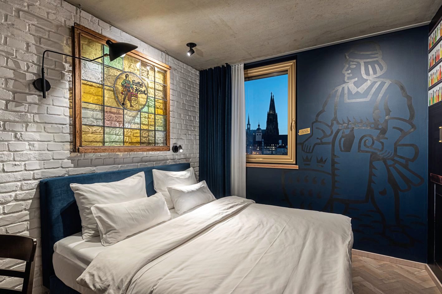 Überall gibt es stilechte Gimmicks wie ein Gaffel-Holzfass, den Kölschen Boore als Wandgemälde oder die Badezimmer-Matte als quadratischer Bierdeckel. 21 original beschriftete Bierdeckel hängen eingerahmt an einer Wand. "Das Gaffel-Zimmer ist detailreich und mit viel Liebe eingerichtet", sagt Thomas Deloy, Geschäftsleitung Marketing und PR. "Nicht nur für Gaffel- und Kölsch-Fans ist eine Übernachtung ein absolutes Erlebnis." Der Dom darf da natürlich nicht fehlen. Aus dem goldgerahmten Fenster fällt der Blick auf das Weltkulturerbe.