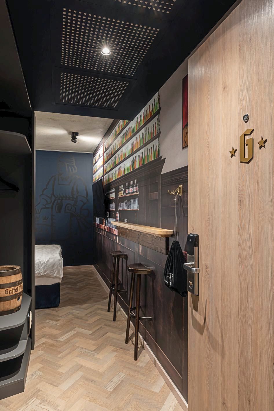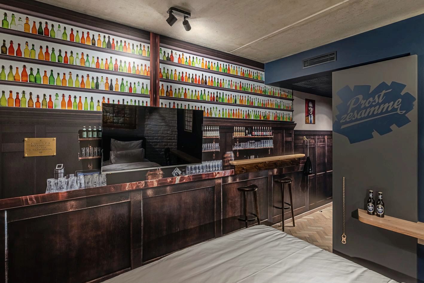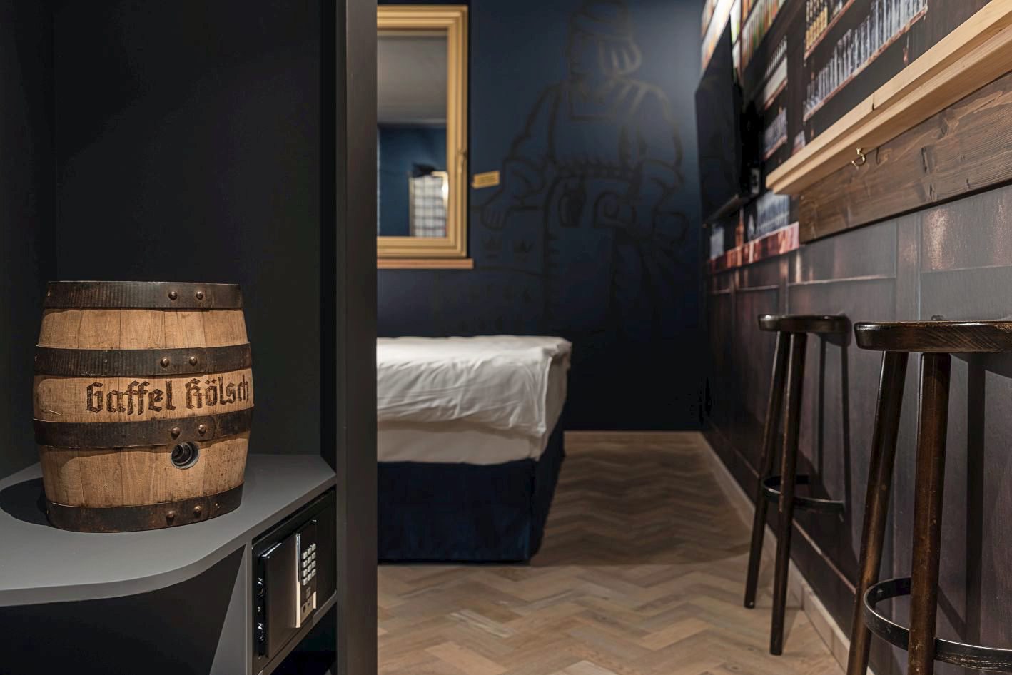 Gäste des Urban Loft Cologne können in einem besonderen Themenzimmer schlafen: Außen hängt ein Speisekartenkasten mit dem Kölschen Grundgesetz. Beim Betreten des der Blick fällt auf eine Wand, die einer Theke im Gaffel am Dom nachempfunden ist. Auf der gegenüberliegenden Seite hängt ein Brauhausfenster aus Bleiglas.