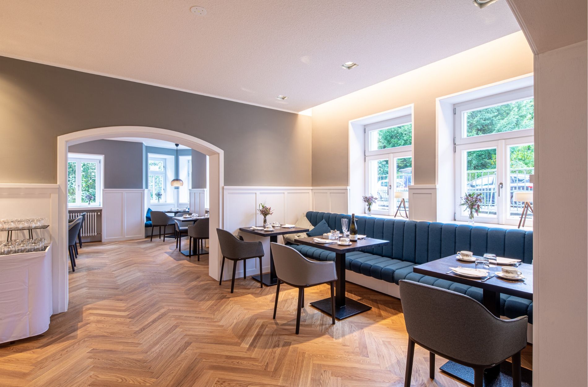 Nach genauer Vorgabe der Denkmalschutzbehörde wurden für das gesamte Hotel neue Holzfenster mit original Holzwetterschenkeln und zweiter Entwässerungsebene geschreinert. Nur ein Beispiel für beeindruckende Handwerkskunst in der Villa Rein. Mehr davon findet sich im Frühstücksbereich mit Eiche-Massiv-Fischgrätparkett und weiß gestrichenen Wandvertäfelungen. Die neu gestaltete Kaminstube kontrastiert das klassische Ambiente mit klarer Formensprache. Mit Altholz verkleidete Wände und raffinierte indirekte Beleuchtung schaffen Wohlfühlatmosphäre, das Panorama-Sitzfenster bietet einen herrlichen Blick in die bayerischen Voralpen. Architektur und Innenarchitektur spielen in allen Bereichen des Hotels raffiniert mit Alt und Neu.