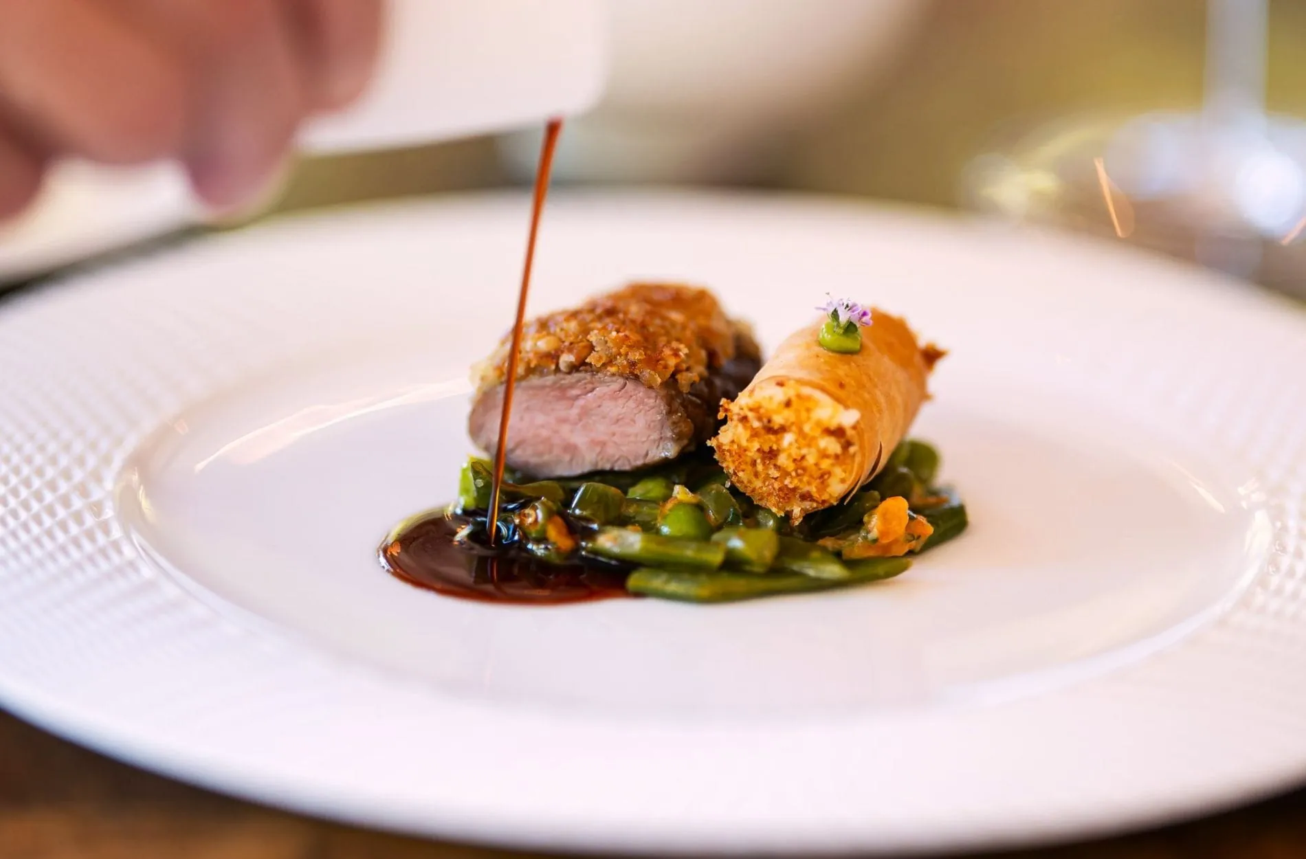Im „Prezioso“ im Castel Fragsburg serviert Egon Heiss das Villnösser Brillenlamm als sommerliche Hommage an Region, Tradition und eine fast vergessene Schafrasse. © Florian Andergassen