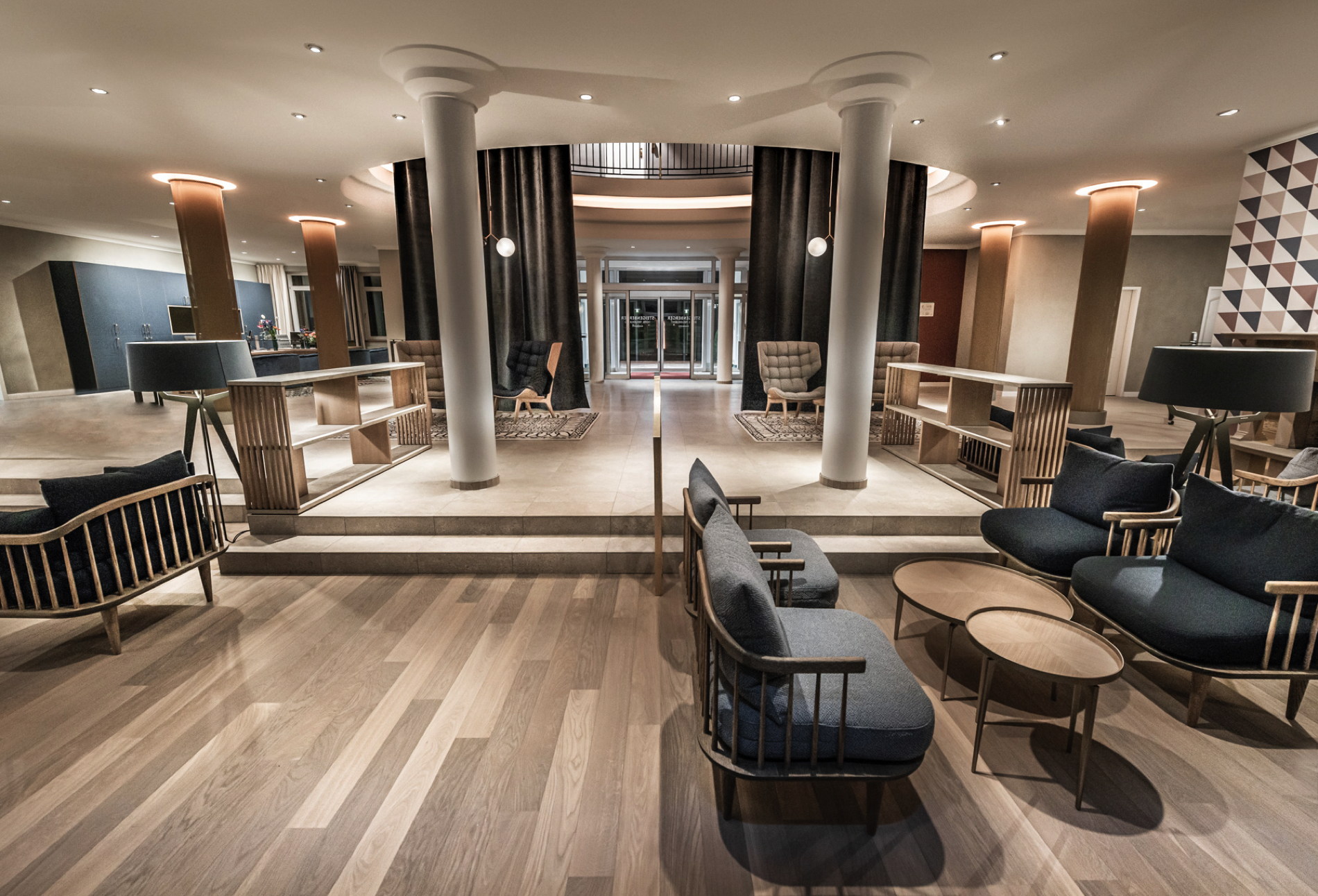 Ein erstes Ausrufezeichen setzt das ehemalige landwirtschaftliche Gut, das 1992 zum Golf-Resort umgebaut wurde und seit 2006 als Steigenberger firmiert, im Eingangsbereich, den die Gäste nur schwerlich wiedererkennen werden. Einerseits wurde der große Empfangstresen gegen zwei Check-in-Desks getauscht, andererseits haben die Interior Designer zwei großflächige Stoffvorhänge installieren lassen, um dem Raum eine Art Vorhang zu verleihen.