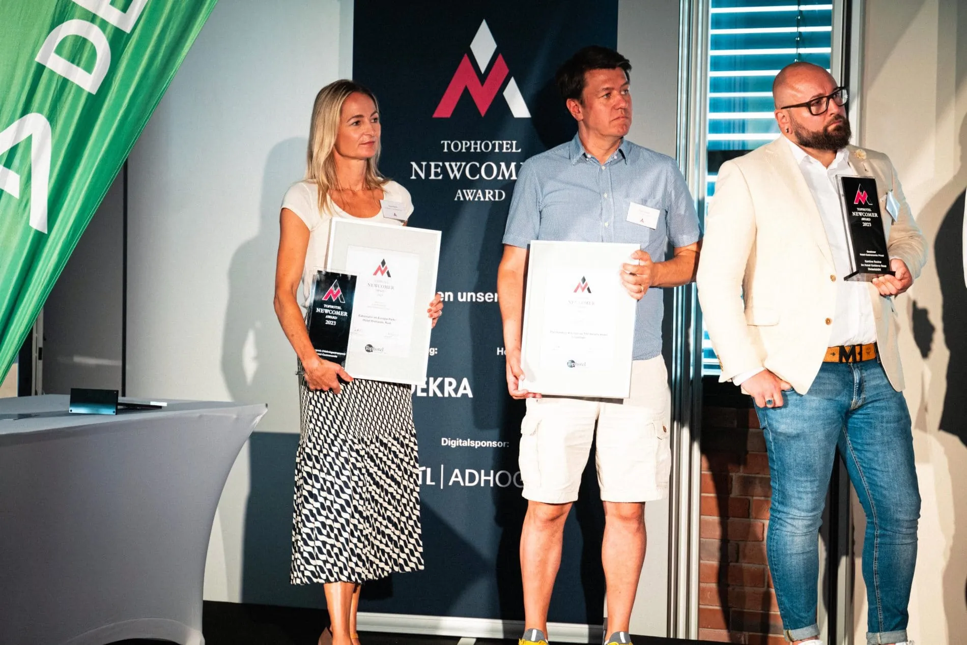 Tophotel Newcomer Award 2023: (von links) Diana Reichle (Eatrenalin), Ralph Hesse (The Hearts Hotel) und Florian Keller (Goldene Rose) bei der Verleihung in der Kategorie Hotel-Gastronomie.