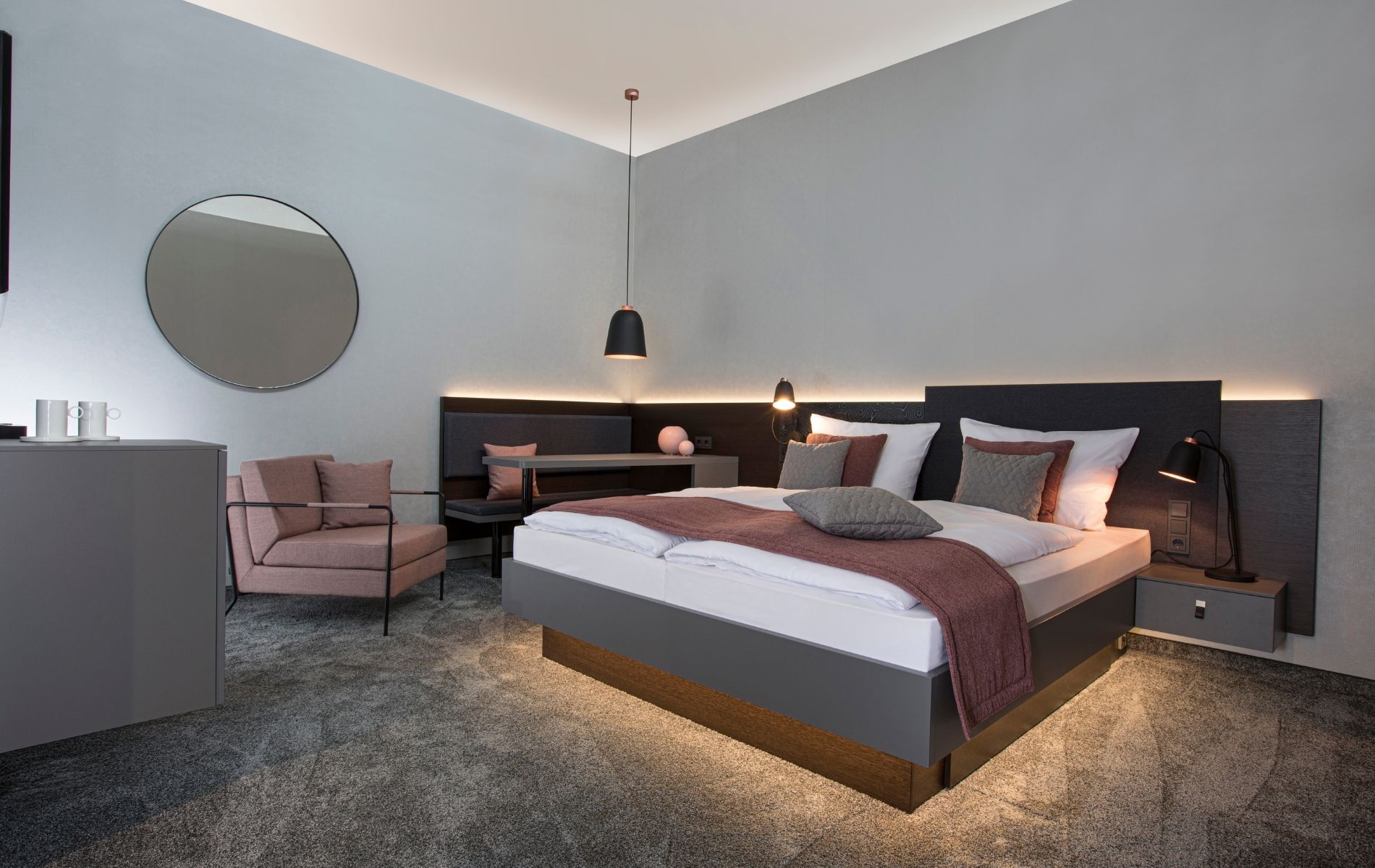 Das Einrichtungskonzept "ZAMETRY" von Zieflekoch Hoteleinrichtung bringt Asymmetrie und ausgewählte Materialien in Harmonie. Die Wandbrüstung ist durchgängig in dunkler Eiche gebeizt. Die Effektbeleuchtung in der Schattenkante der Brüstung sowie im Bettkasten sorgt für eine stimmungsvolle Atmosphäre. Spannend wirkt das hochgezogene Paneel mit Stoffbezug auf der einen Betthälfte. Auf der anderen Seite sind die Übergänge fließend von Nachttisch zum Schreibtisch mit gepolsterter Sitzbank und Rückenpolsterkissen an der Wandverkleidung. Die Bank und der Schreibtisch sind einseitig schräg eingebaut und andererseits – wie leicht schwebend – mit schwarzem Stützfuß befestigt. Das TV-Element vereint Infotainment mit genussvollen Pausen an der Minibaranrichte mit praktischer Ablage für die Café-Station. "ZAMETRY" inspiriert durch Perspektivwechsel.