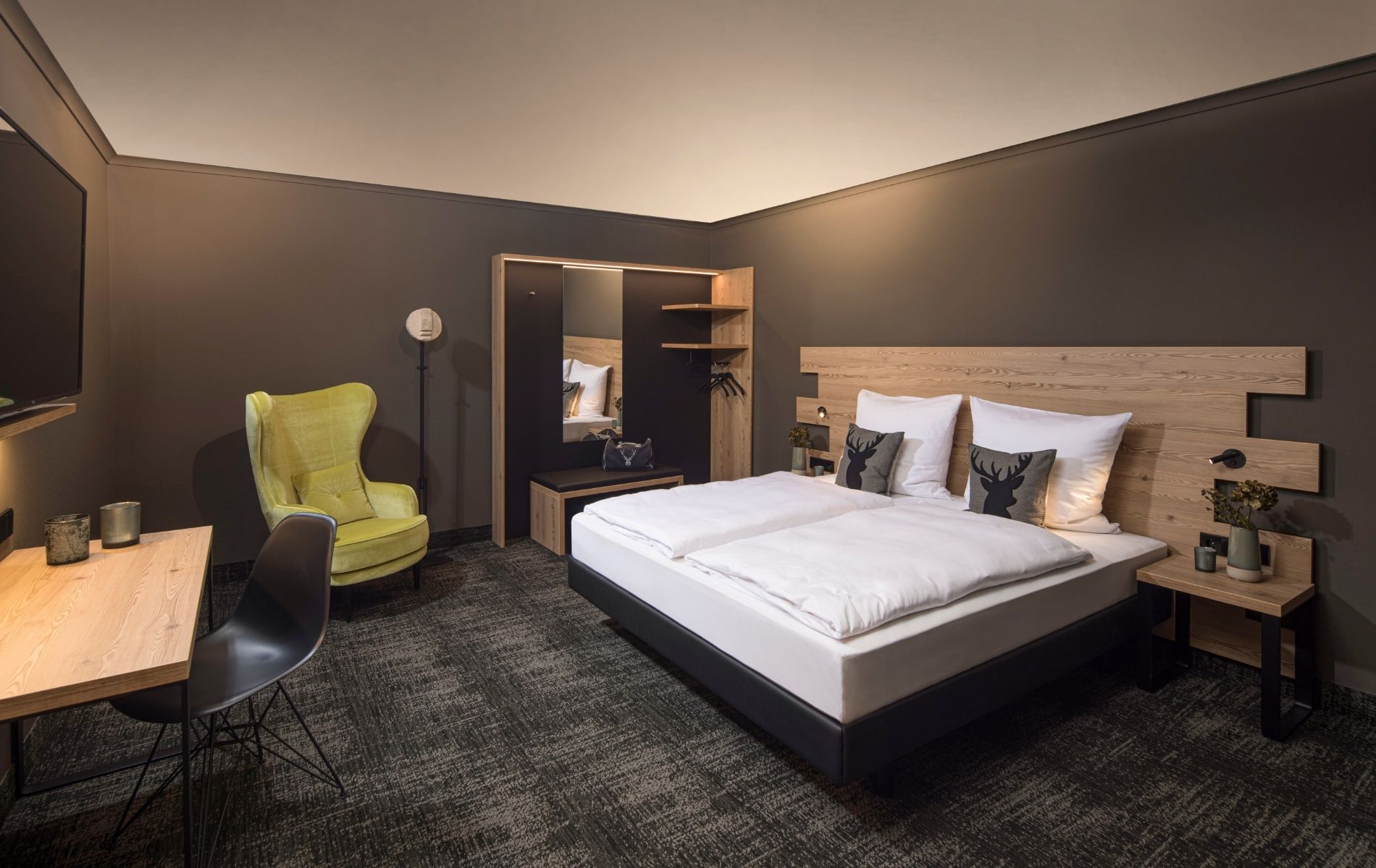 Das Hotelzimmer-Programm "ZADORO" von Zieflekoch Hoteleinrichtung verbindet städtischen Komfort mit ländlicher Gemütlichkeit. Blickfang ist das Bettkopfhaupt mit raffinierter, seitlich abgestufter Bretteroptik aus Berglärche. In Kombination mit dem Bettrahmen in dunkler Lederoptik ergibt sich ein behagliches und zugleich smartes Ambiente. Das Ensemble von Kleider- und Garderobenschrank ist elegant offen gehalten mit indirekter Ambiente-Beleuchtung. Holztöne kombiniert mit Anthrazit sowie Schwarzstahl setzten weitere Design-Akzente.