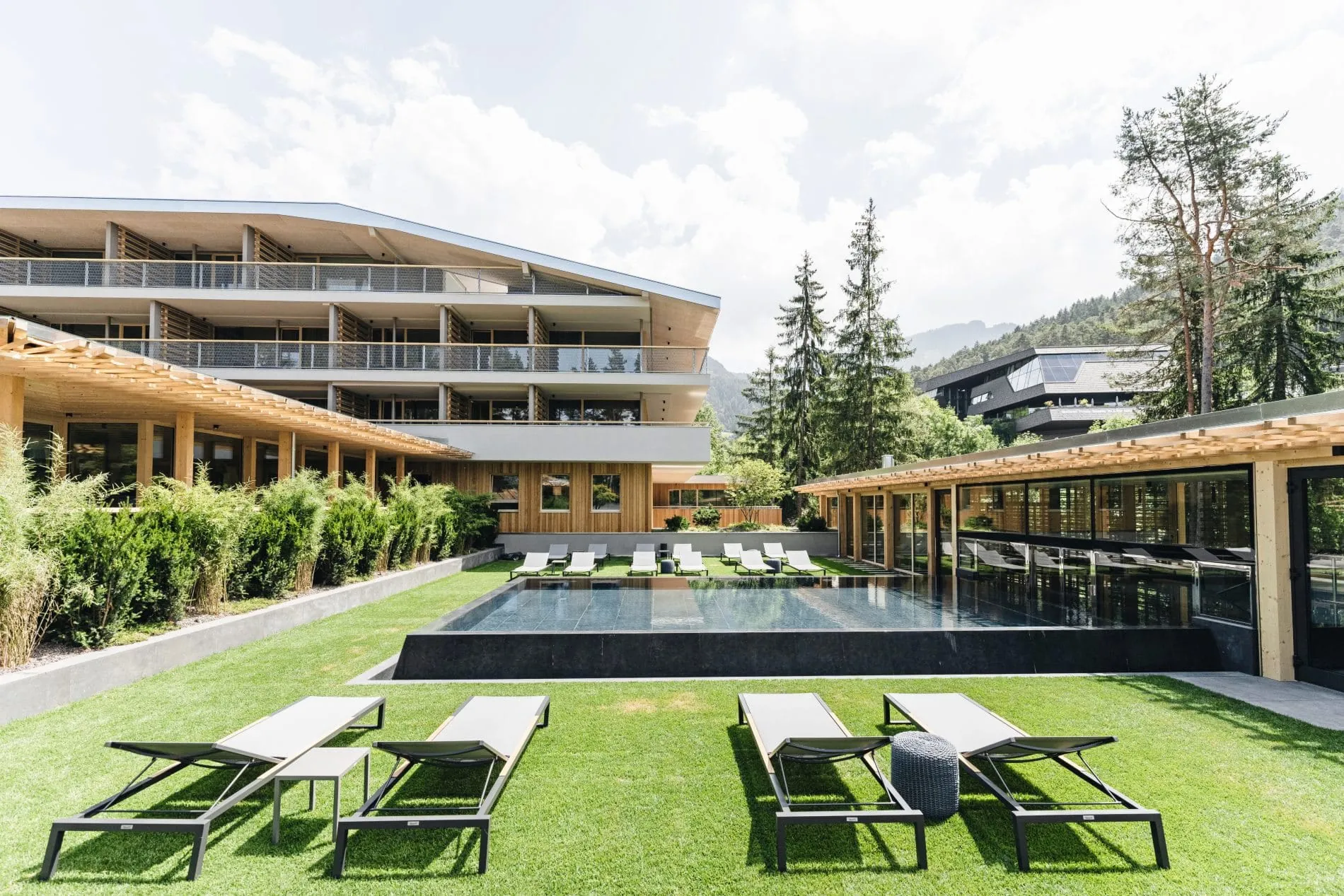 Lag die Betriebswohnung vor dem Umbau im ersten Stock, wo Gäste sehen konnten, wann die Hoteliersfamilie die eigenen Räumlichkeiten verließ, so liegt sie nun, mit separatem Zugang, im Parterre. Früher gab es an dieser Stelle Gästezimmer, die aber nicht zu den gefragtesten zählten: Aufgrund des benachbarten Waldes waren sie eher schattig, und die angrenzende Hotelwäscherei war akustisch wahrnehmbar. „Wir hingegen lieben das ‚Forest-Feeling‘ mit dem mystischen Bach vor der Tür“, so Lea Oberhofer, für die ohnehin die Vorteile überwiegen: „Nach meinem Eindruck wirkt es sich positiv auf die Effizienz und Produktivität aus, im Hotel zu wohnen, ebenso auf die Customer Experience.“ Um die Privatsphäre zu schützen, hat das Ehepaar Oberhofer-Leitner stille Stunden beziehungsweise Tage definiert. An diesen ist es nur bei wirklich extremen Notfällen erreichbar und wird ansonsten von der Direktionsassistenz vertreten. Die zuvor selbst genutzte Eigentumswohnung wurde übrigens in Mitarbeiterunterkünfte umgewandelt, „die man sich wie eine Studenten-WG vorstellen kann, mit mehreren Einzelzimmern samt eigenem Bad“.